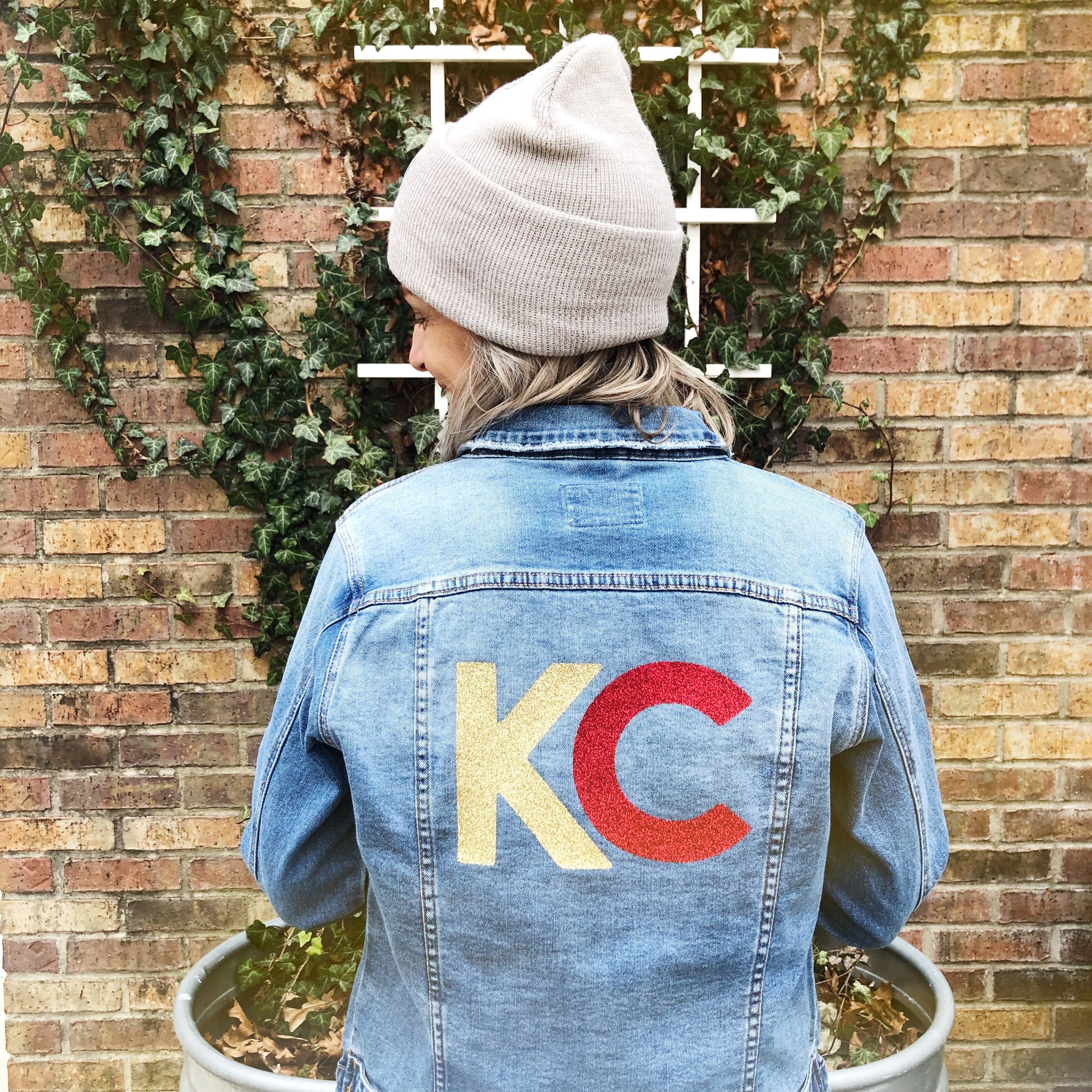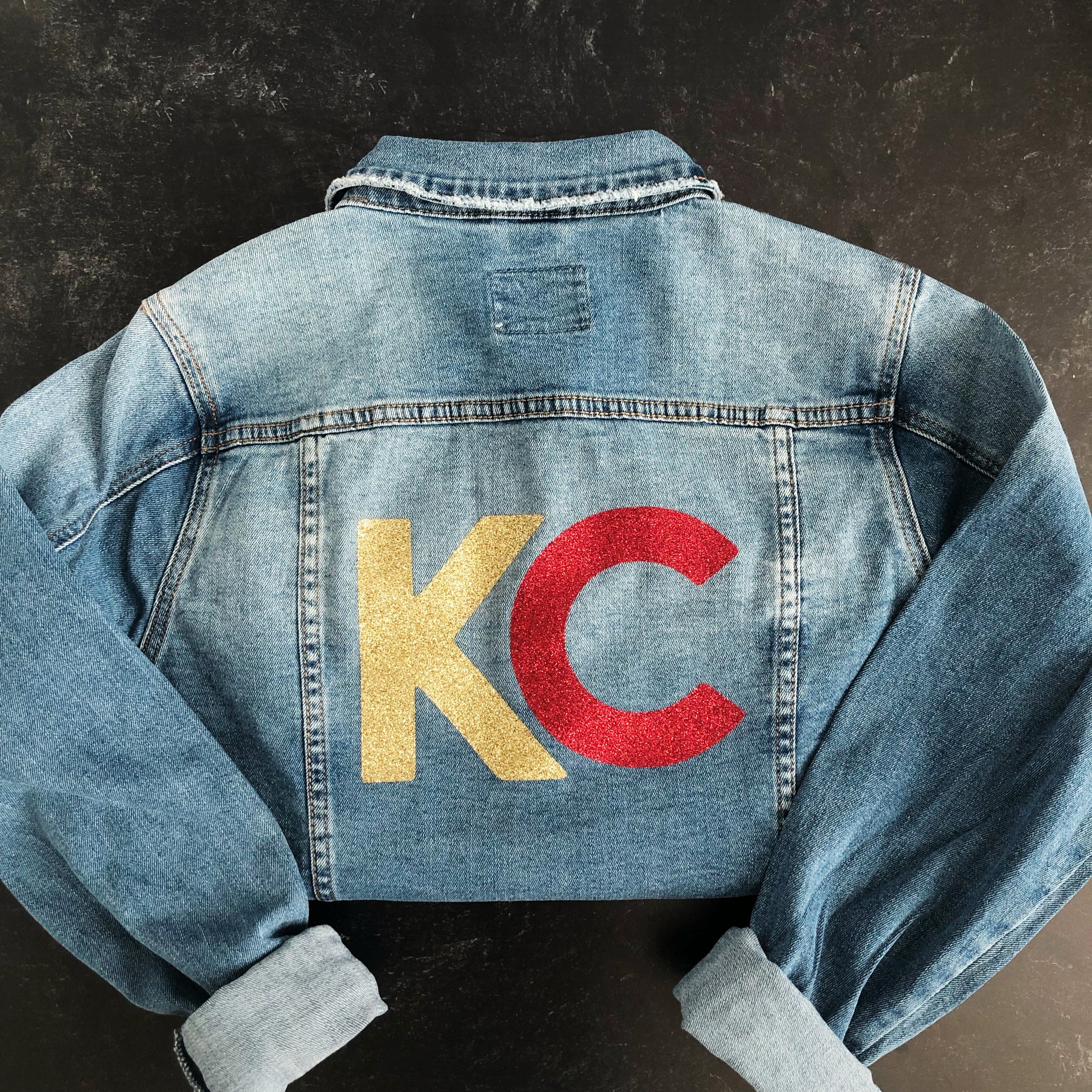 I&M denim, with glittery KC on the back! Support your KC Chiefs and look adorable while doing so!